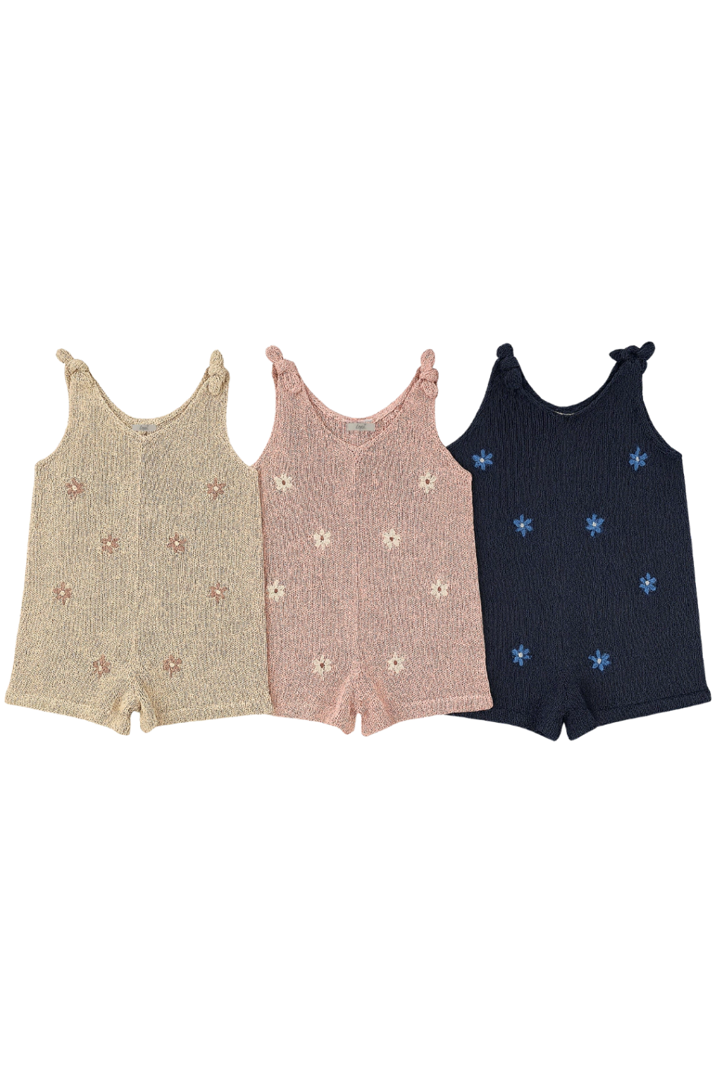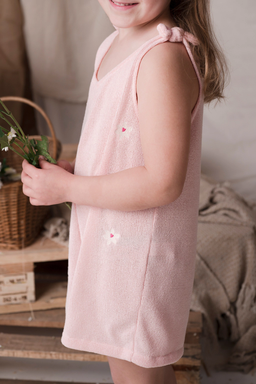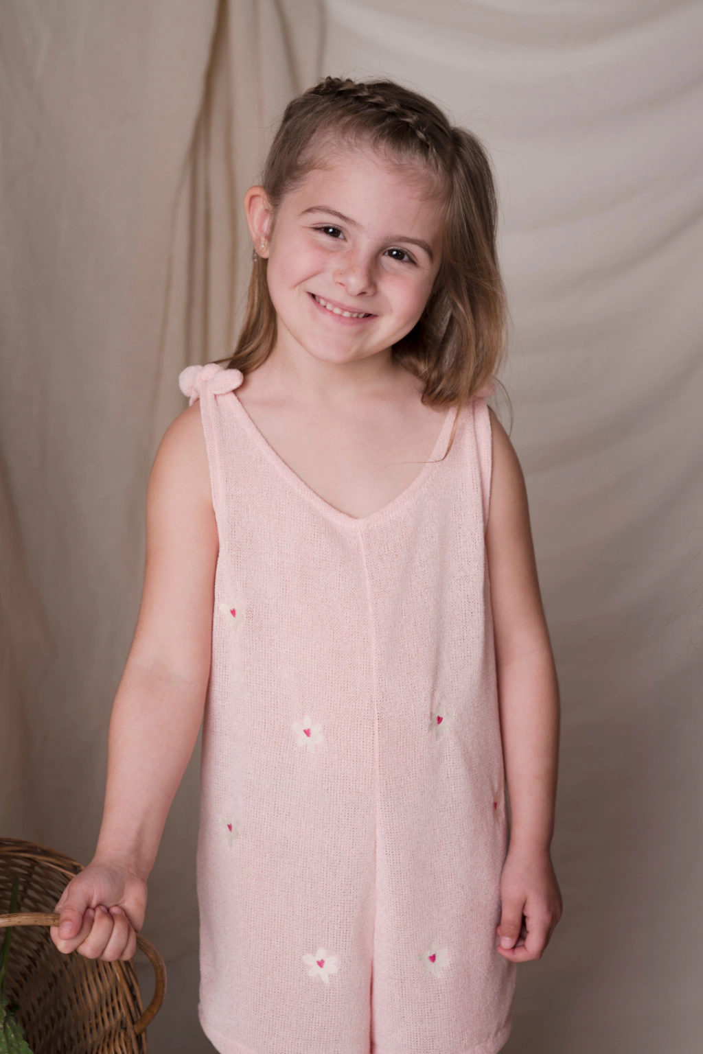 Enterito de nena confeccionado en género de punto tejido summer con flores bordadas a dos colores en delantero.