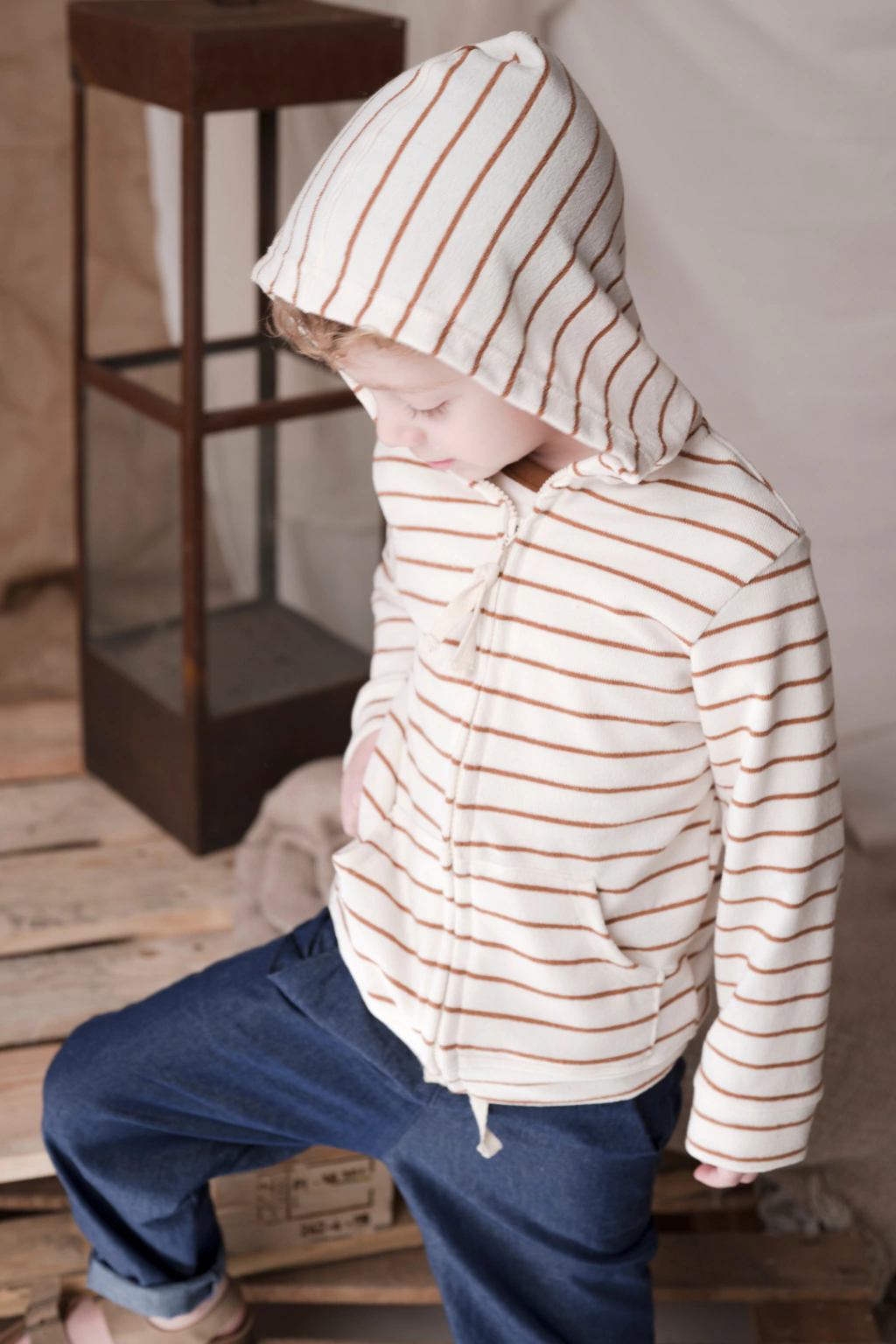 Conjunto de pantalón y campera tipo hoodie, práctico y canchero para todos los días. El pantalón de denim, con bolsillos, cintura con elástico y lazo ajustable, asegura comodidad y libertad de movimiento. La campera en algodón rústico rayado, con cierre, capucha y bolsillos, completa el look con un estilo casual y versátil.