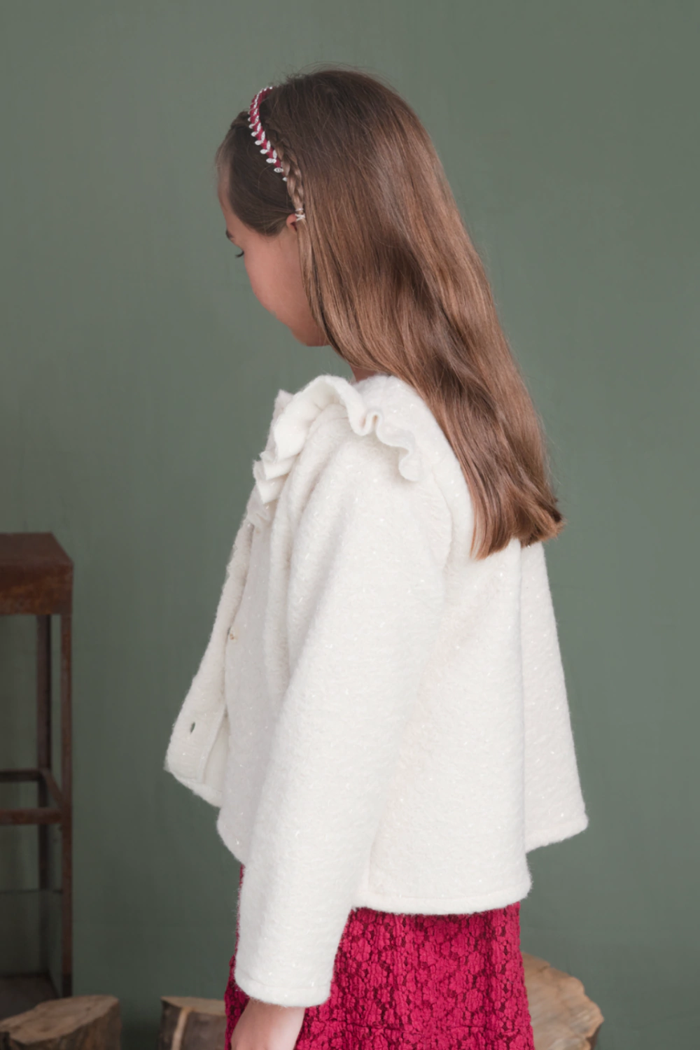 Sacón de nena confeccionado en paño con destellos de lúrex, volados en pechera y hombros.