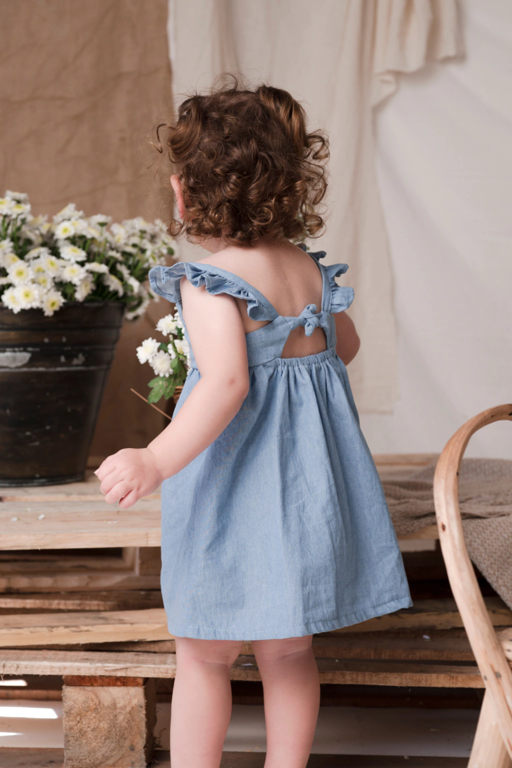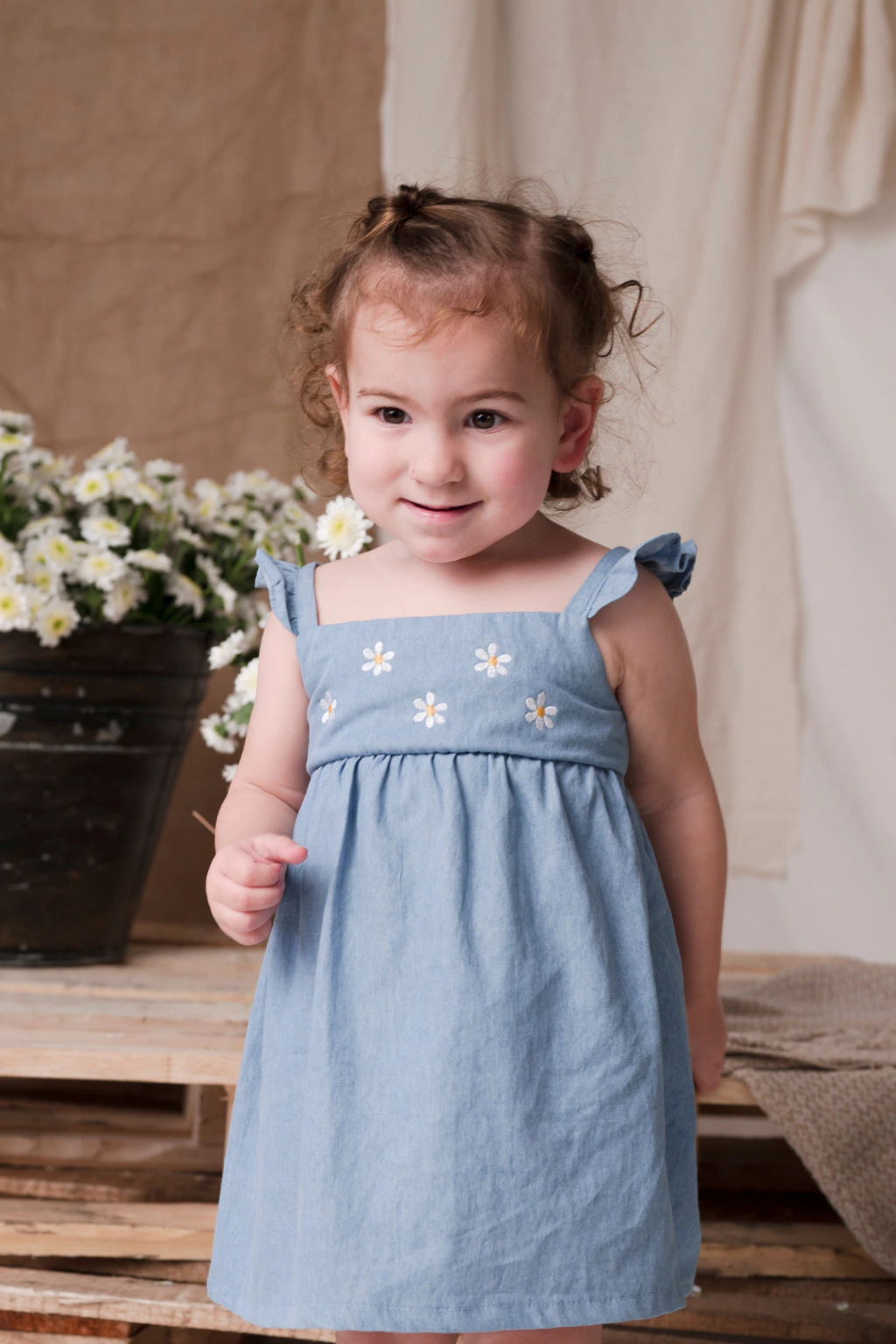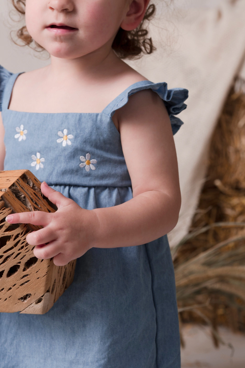 Vestido de bebé confeccionado en denim liviano, con volados en los breteles y delicadas margaritas bordadas en la pechera.