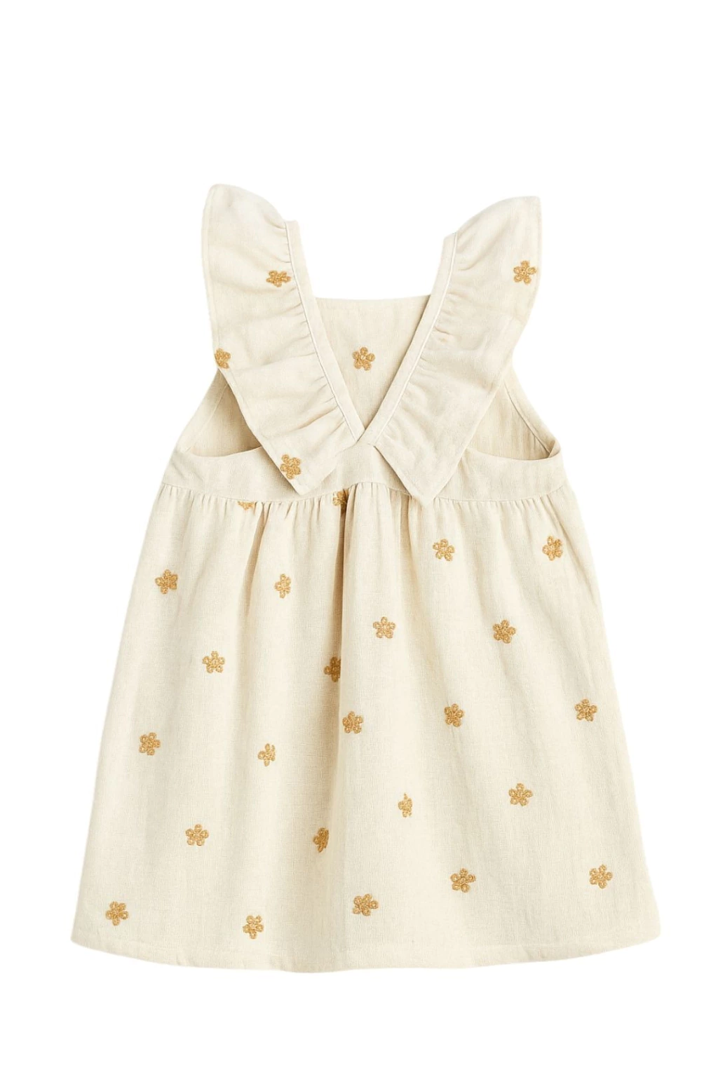 Vestido de nena confeccionado gasa bordada con corte de manga ranglan y volado en el escote.