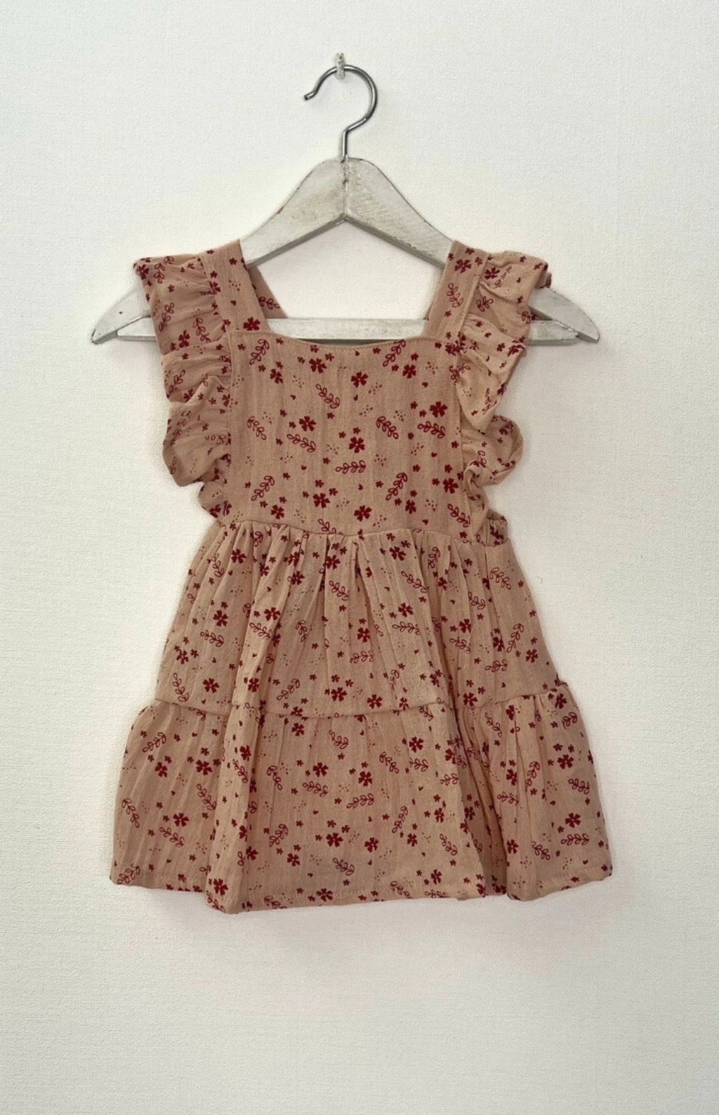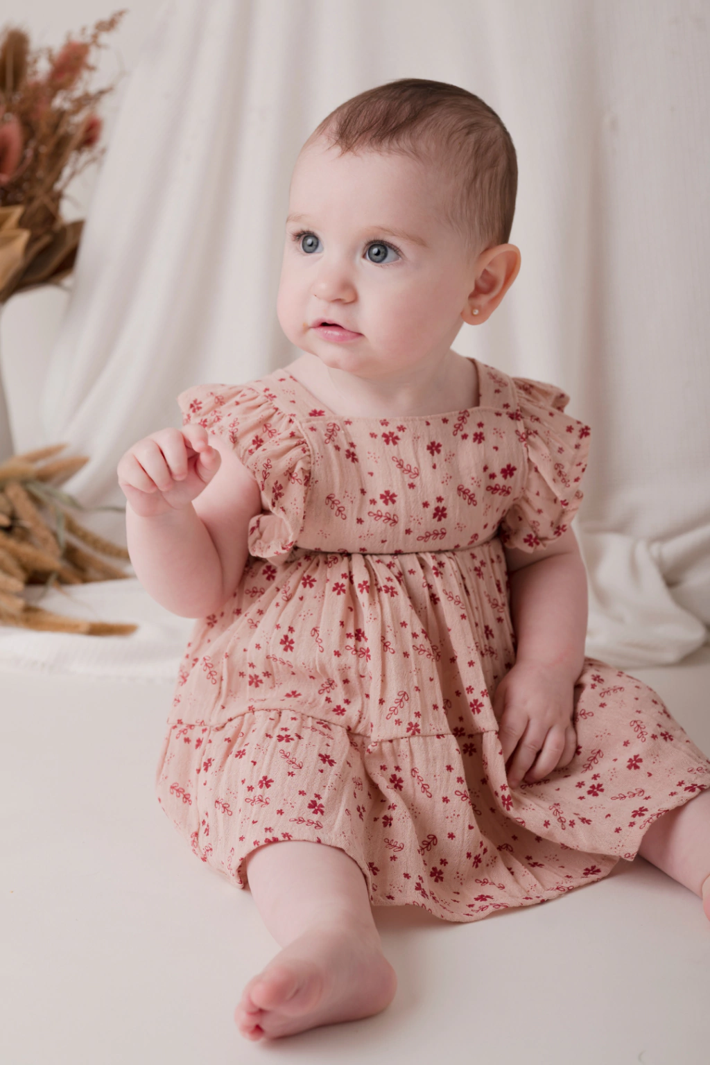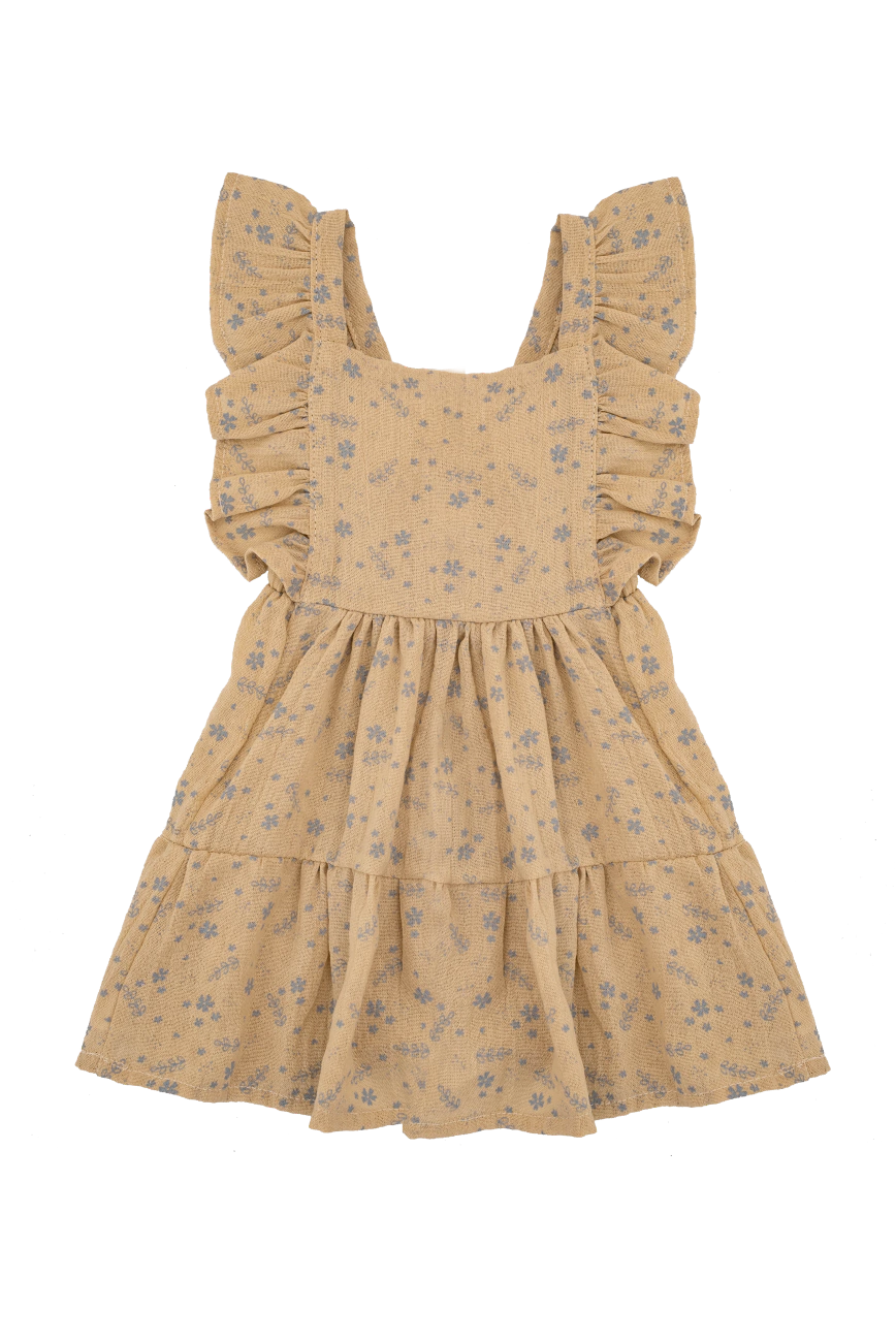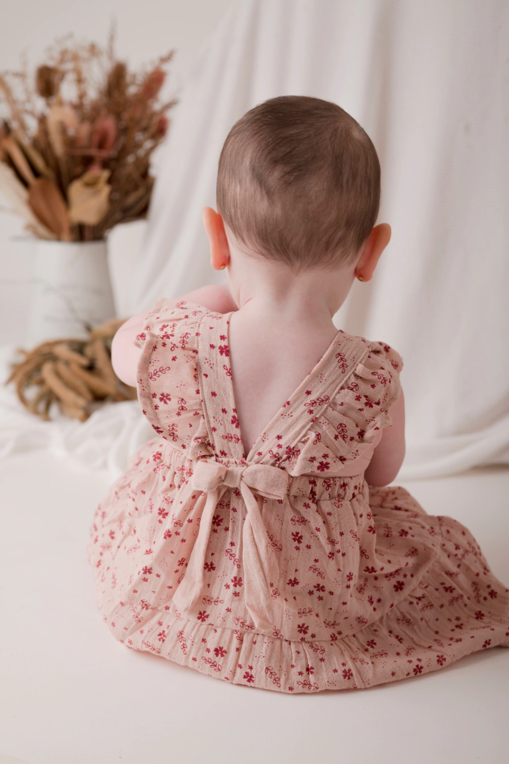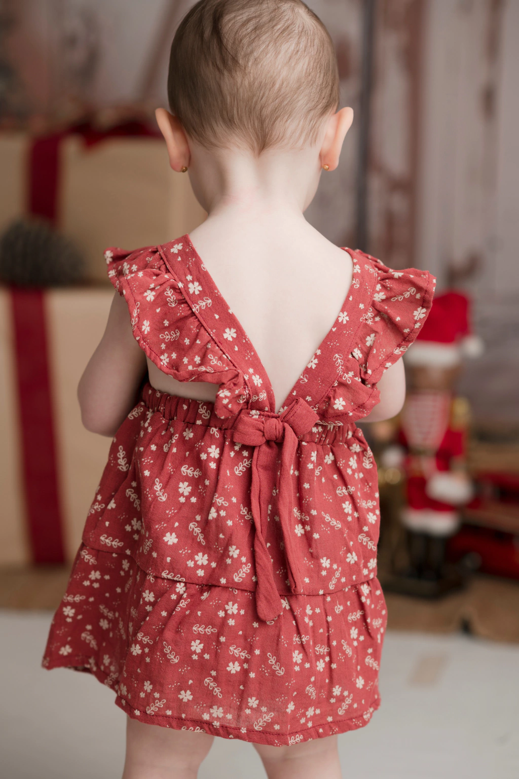 Vestido de gasa de algodón estampado con volado en breteles y detalle de lazo en la espalda.