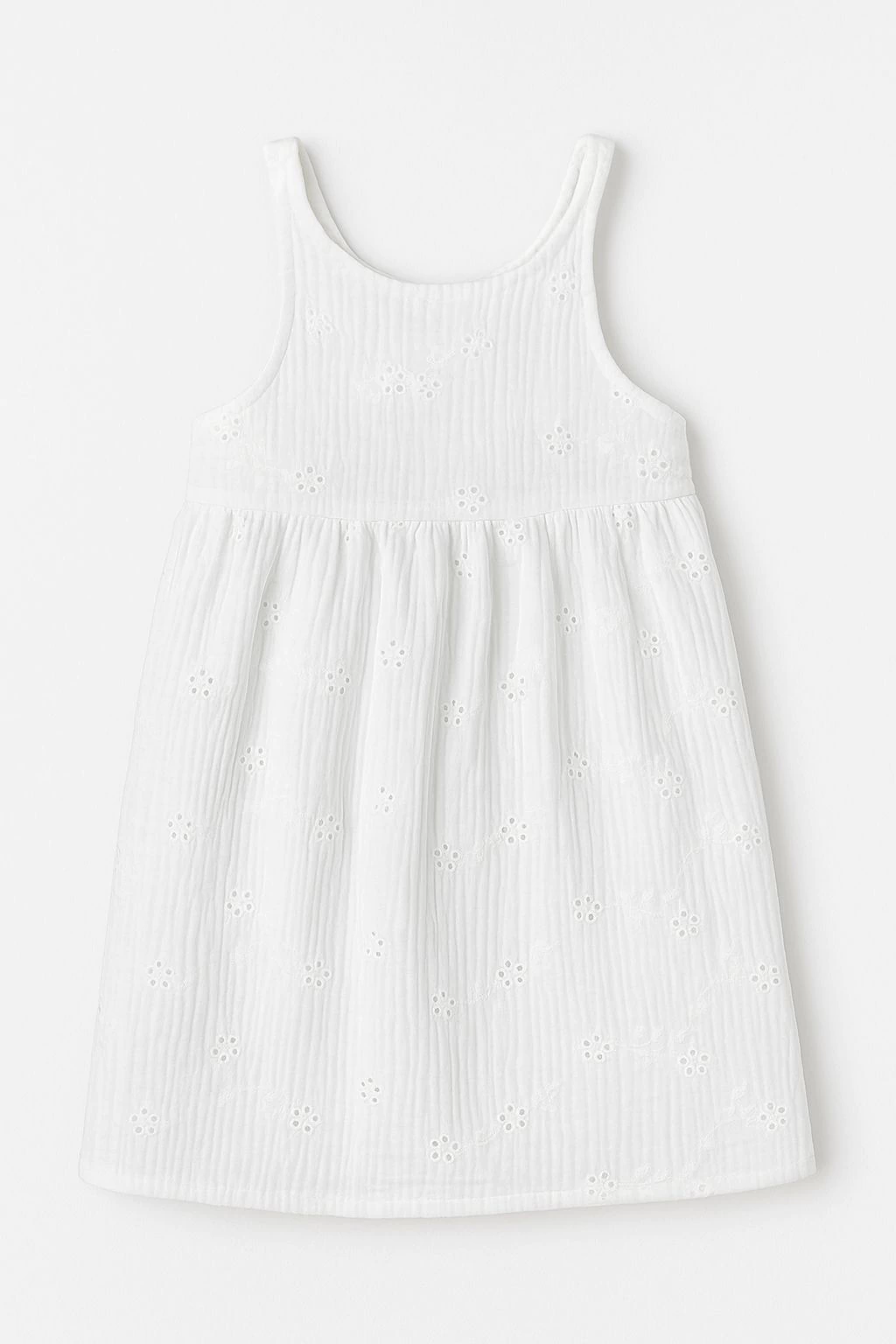 (Se recomienda comparar con una prenda similar que le quede bien) Vestido de nena confeccionado en gasa con pechera de macramé y espalda anudada. Viene en colores off white y beige.