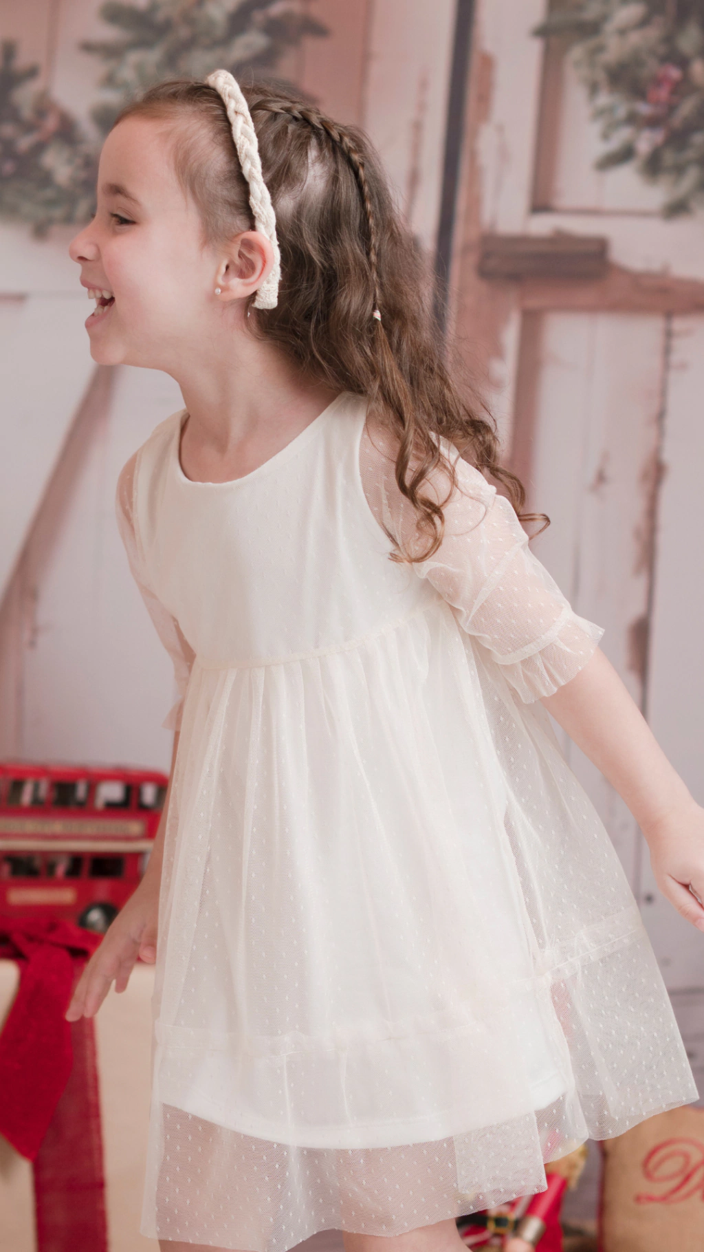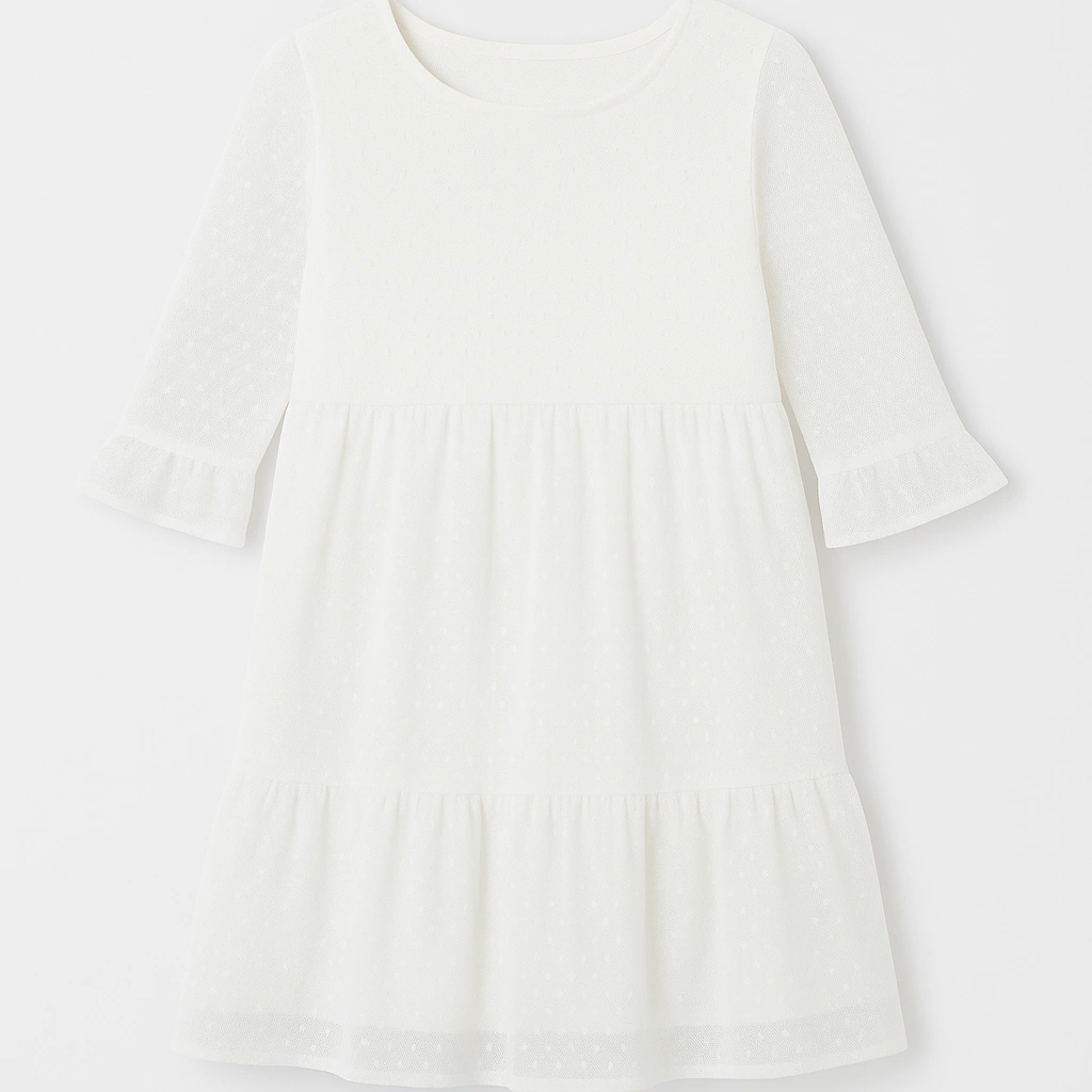 Vestido de tul plumetí de mota chica con volados en puño y en la sobrefalda, con forrería de punto.